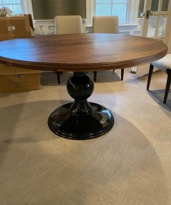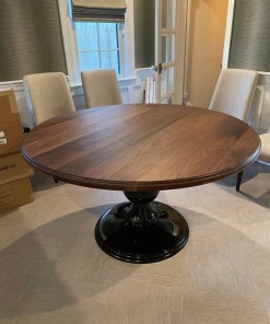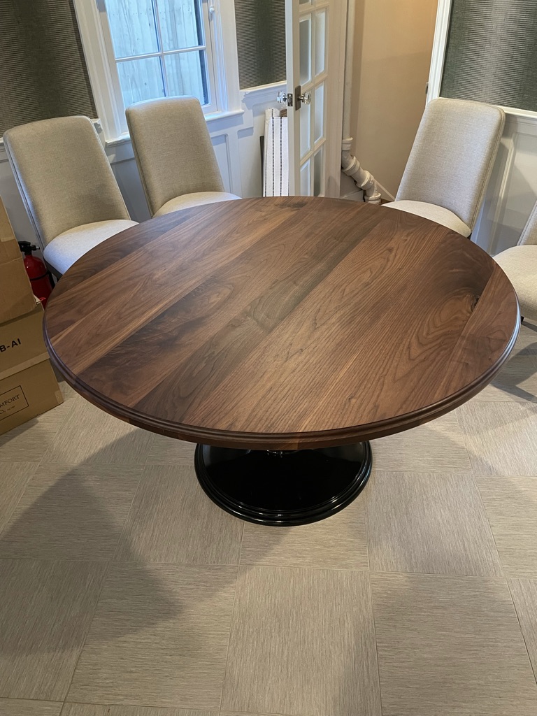 Our Round Pedestal Table is a stunner! Designed in partnership with a local designer and shown here in Walnut with an Ogee edge profile on a gloss black base.  This table can be made in a variety of wood species and colors. It is a versatile design that can fit any room, from an elegant kitchen to a man cave or cigar room.